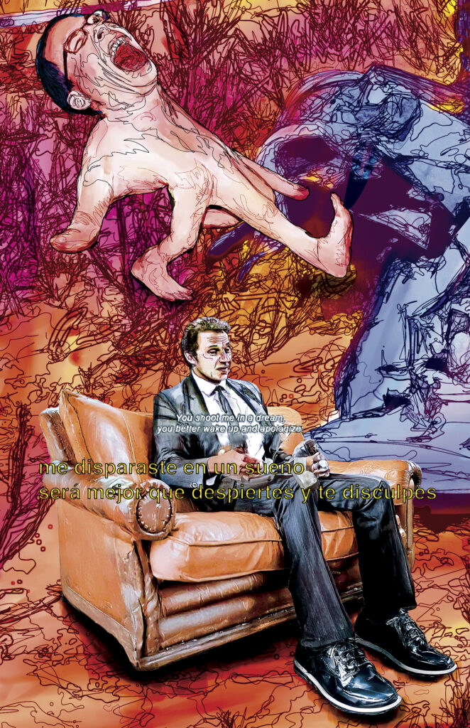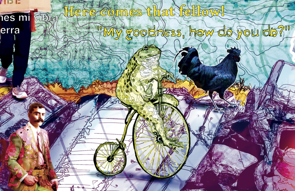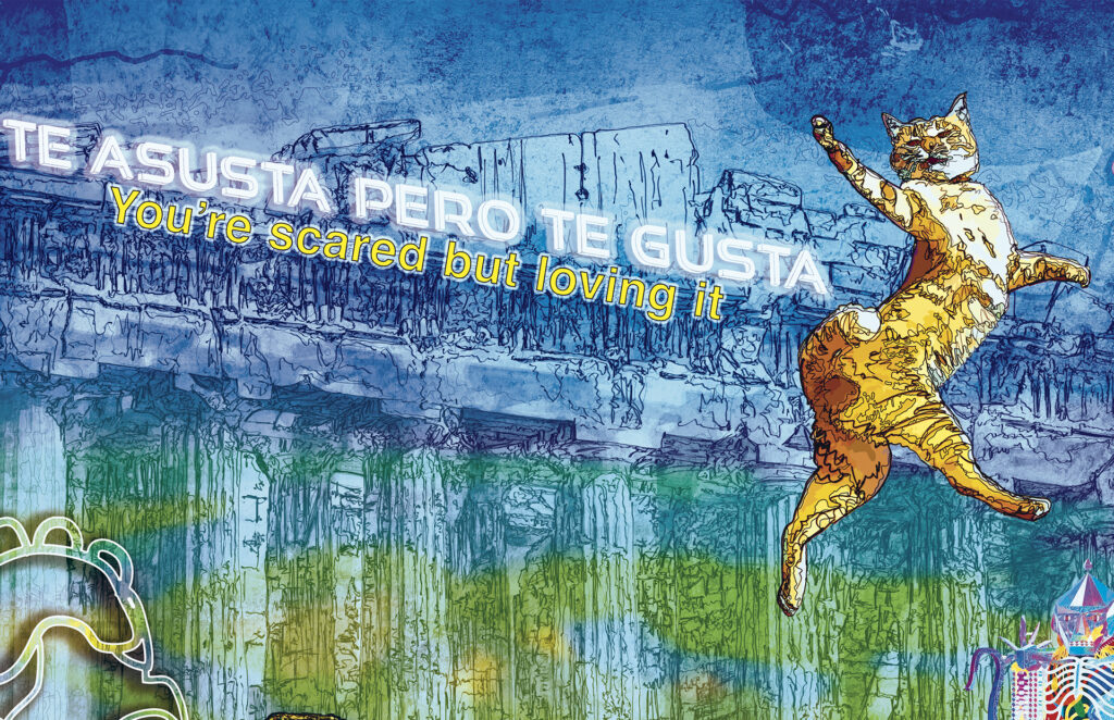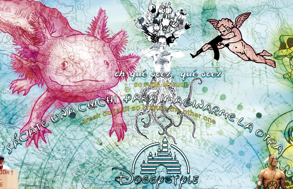 Pasa la jirafa, el changuito sacándose la mugre de las uñas con su filo,¿pero, tú qué haces aquí changuito? Esperando al león para partirle su madre. Pasa el hipopótamo, el changuito con su filo así midiendo el horizonte, ¿qué estás haciendo aquí changuito? Aquí esperando al león para partirle su madre. Pasa la zebra, el changuito rascándose con el cuchillo la espalda, ¿changuito qué haces? Nada, nada, aquí esperando al león para partirle toda su pinche madre. Llega el león con el pecho en alto, ¿que me estabas buscando changuito, qué haces? Nada, nada, ya sabes, aquí de culero y hablador…